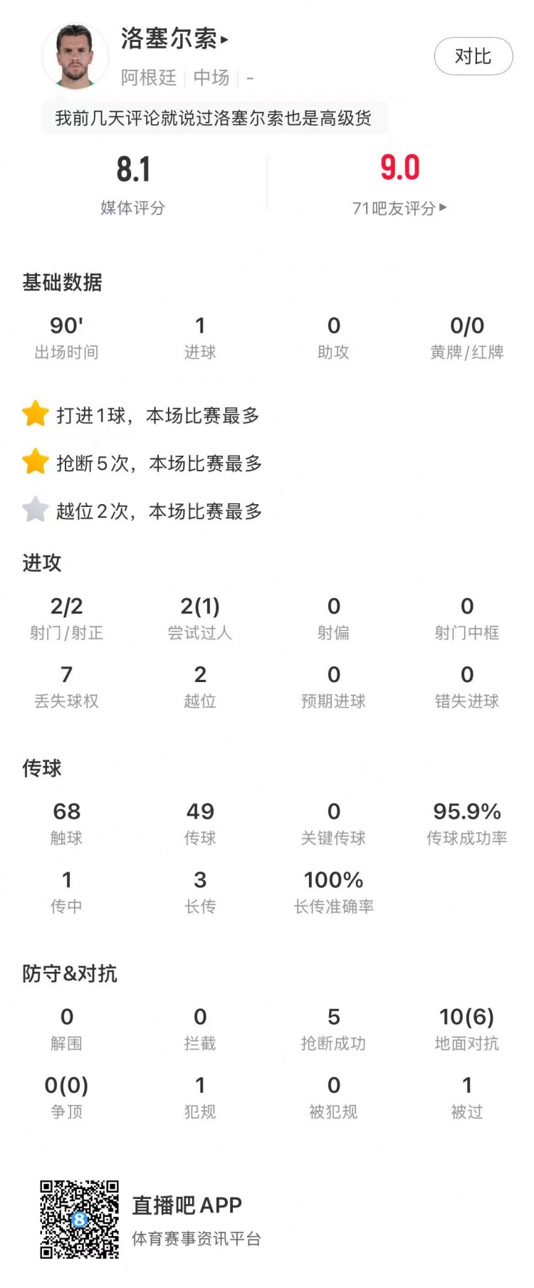 - 打进制胜1球!洛塞尔索全场数据:2射2正,5次抄截 ,获评8.1分