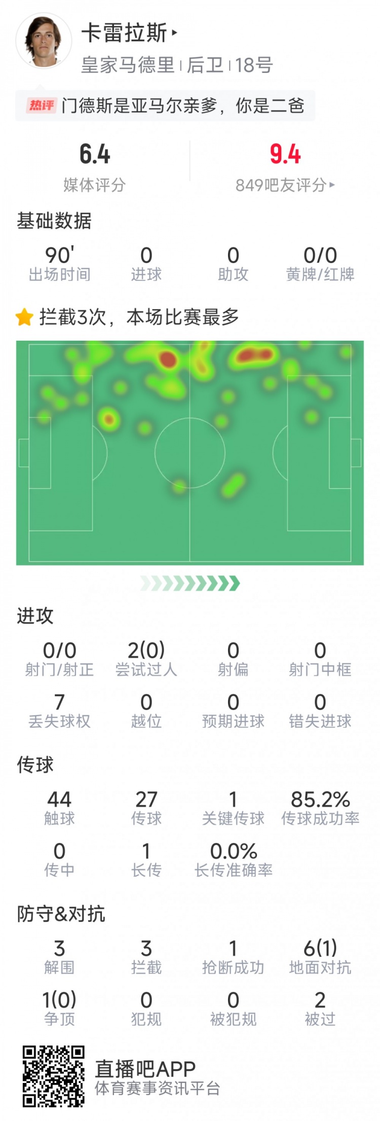 - 卡雷拉斯本场数据:3次解围,3次阻拦 ,1次抄截 ,1次关键传送球