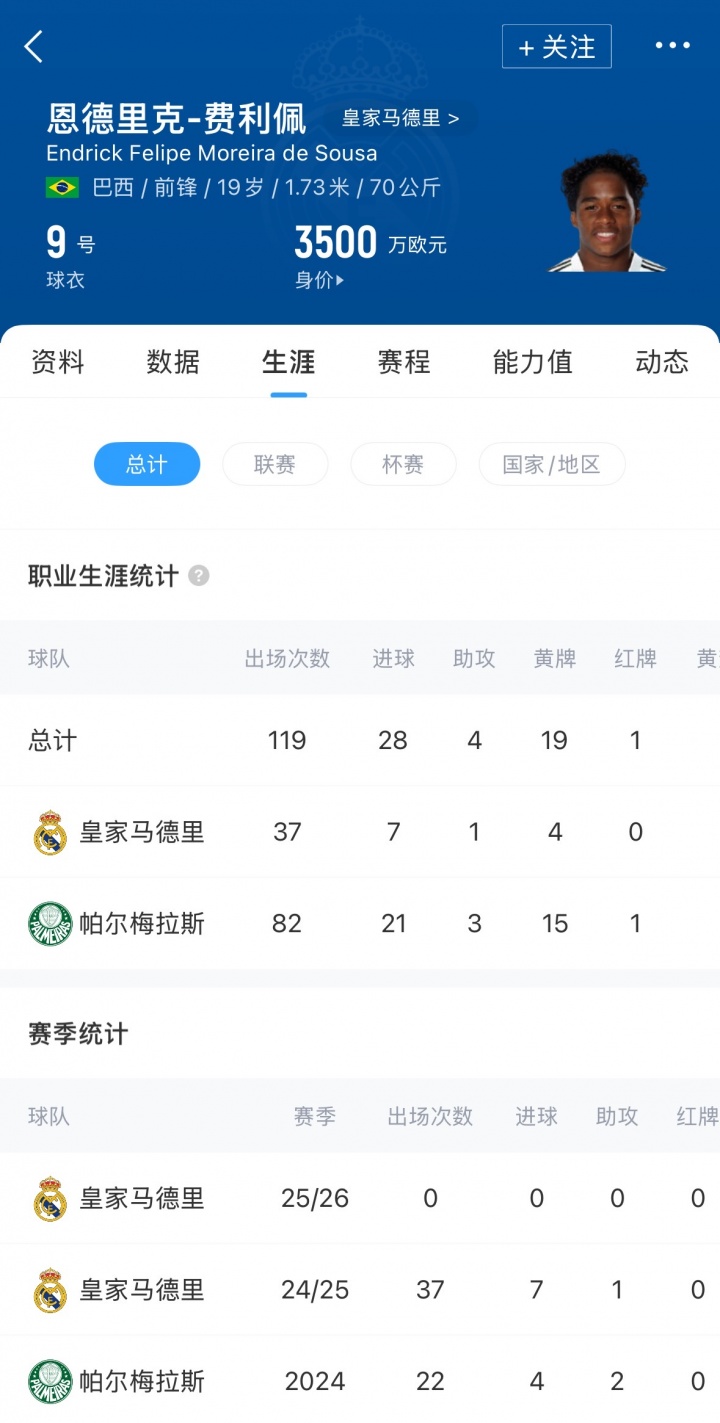 即使是对阵莱万特和凯拉特的赛事 ,恩德里克仍坐在后备 席,即便球队有巨大领跑 优势,他甚至都没有获得赛前热身 机会。恩德里克理想 着跟随巴西参加2026世界杯赛 ,但缺乏出场时间可能会让他与国家队大名单渐行渐远。最近一期巴西队名单,恩德里克则再次落选。