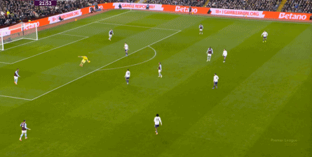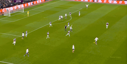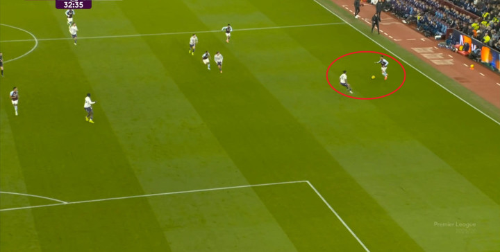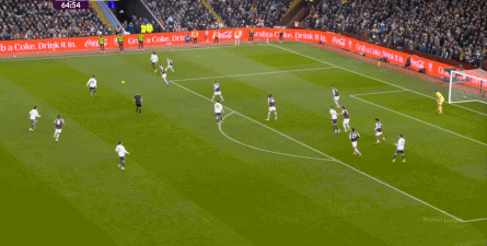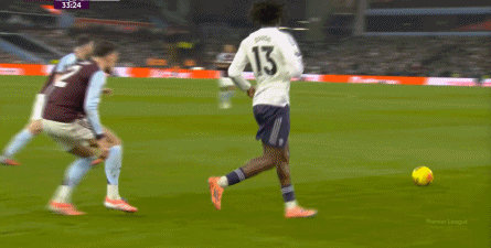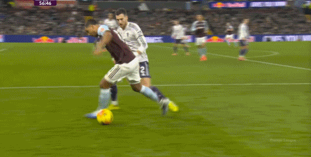 赛事 第33分钟,维拉在后场轻松起脚,沃特金斯和队友在海文和乌加特的身上打出并保住优势,从而将球权转给了边路的罗杰斯,让他有了和约罗一对一的机会: