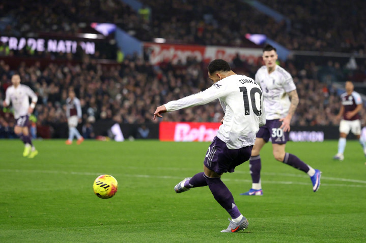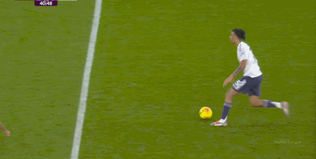 因此在赛事 开局,反倒是曼联打得更为主动,在无球阶段的逼抢意愿更强,从而逼出维拉的大脚,然后借助海文的解围、芒特的衔接和维拉后场球员的帮忙,让库尼亚获得了几乎是全场最舒服的一次起脚机会:
