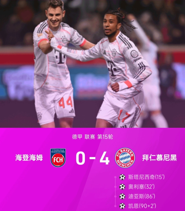 同日凌晨进行的德甲第15轮赛事 中,拜仁慕尼黑客场应战 应战 海登海姆,最终以4-0的大比分完胜对手,进一步扩大了积分榜上的领跑 优势。