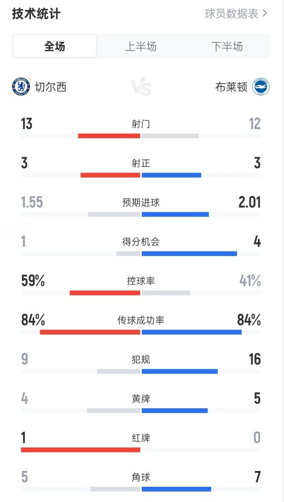- 切尔西1-3布莱顿全场数据: 射球 13-12, 射正3-3, 盘带时间 59%-41%