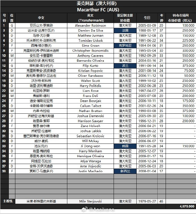 - 25-26赛季亚冠二级职业联赛 (小组赛阶段)澳大利亚麦克阿瑟球员名单