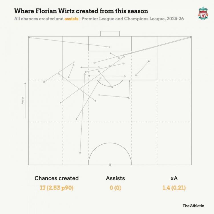 维尔茨这赛季到目前为止的触球点,分布在运动活动 场 各个区域,远比你对一个单前腰所预期的要分散,而且和他在勒沃库森时习惯活动的区域明显不一样。
