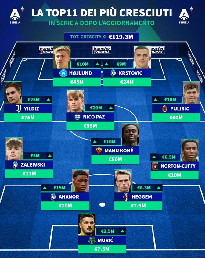 - 意甲球员身价涨幅阵:霍伊伦、普利西奇、伊尔迪兹、帕斯在列