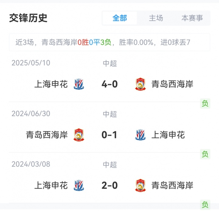 青岛西海岸9胜9平8负积36分,排名中超第8;上海申花16胜6平4负积54分,排名中超第3。