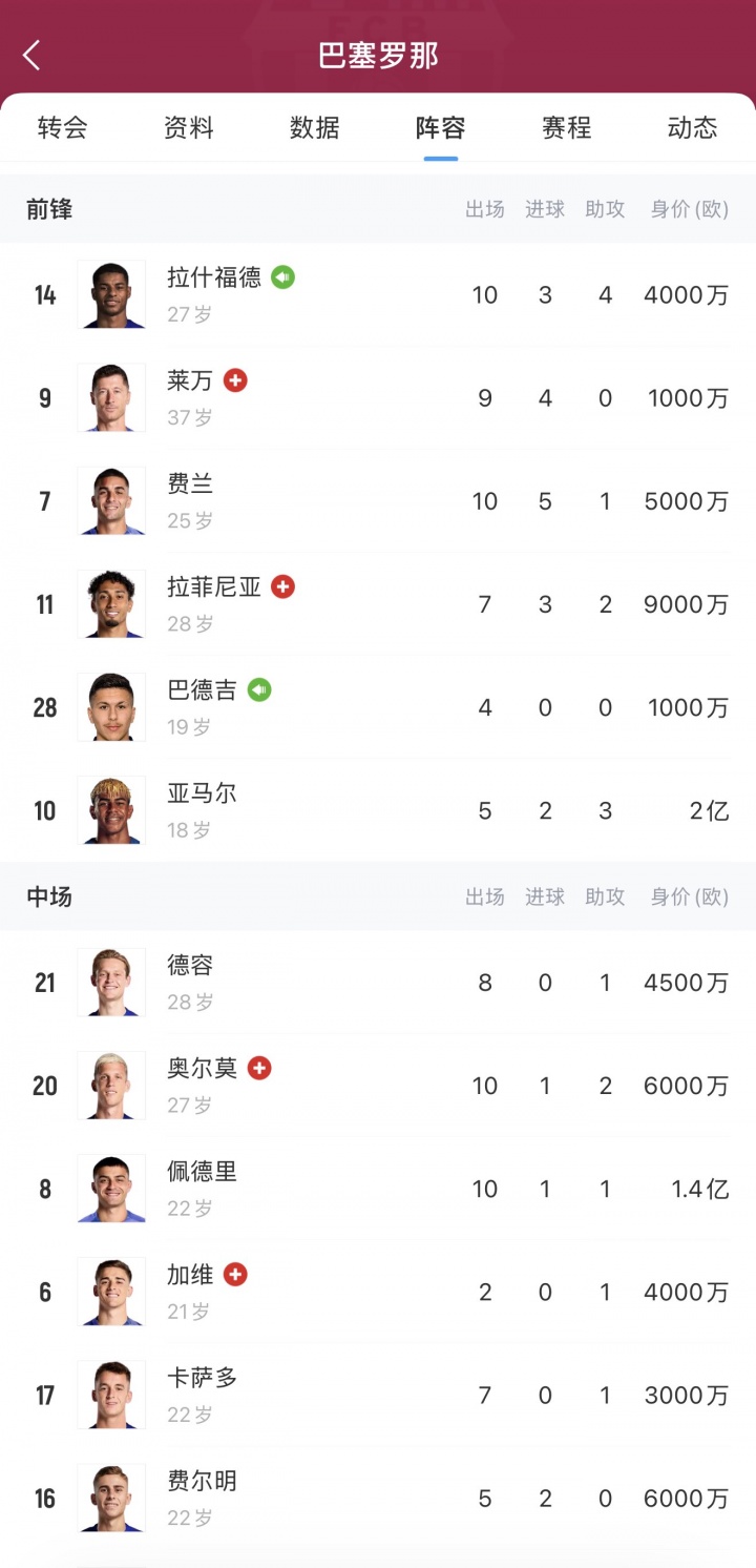 - 拉什福德五号位?目前莱万、费兰、拉菲尼亚、奥尔莫均高挂免战牌