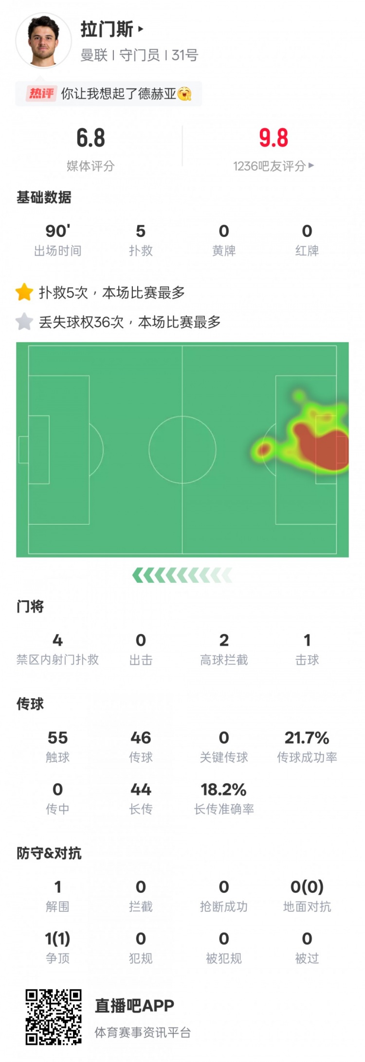 - 拉门斯本场数据:5次抢救 +36次丢失球权均是全场最多,评分6.8