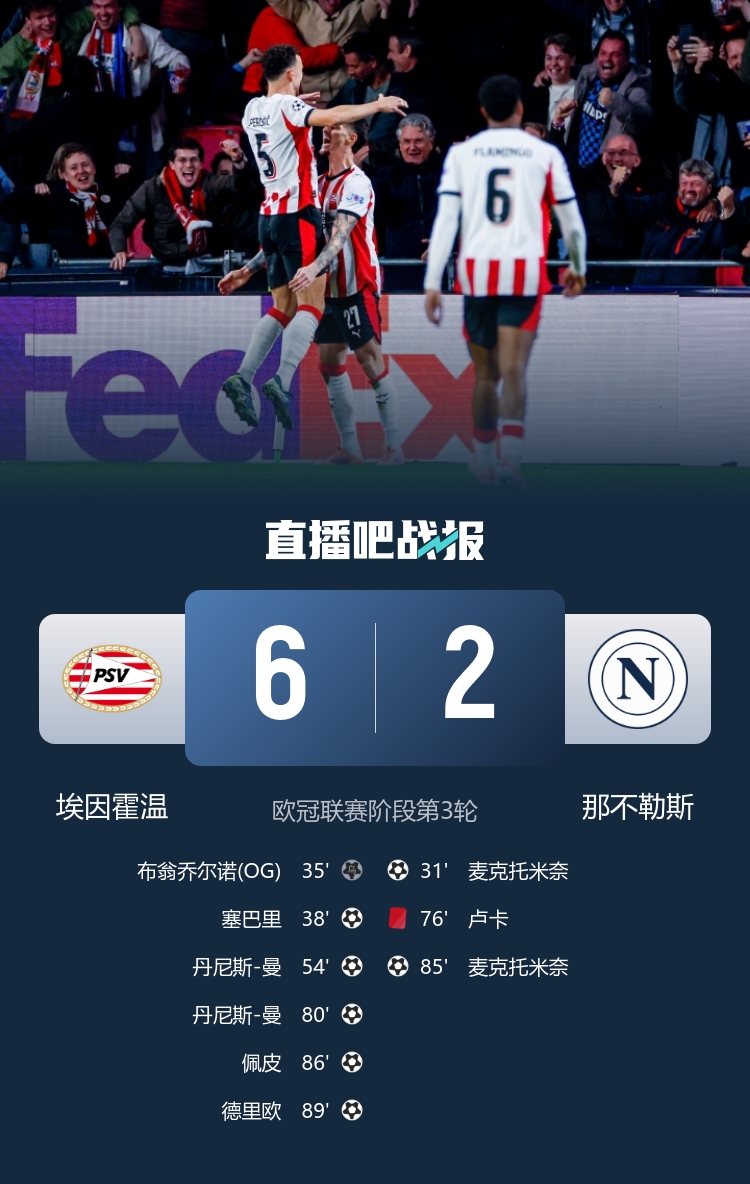 10月22日讯 欧冠职业联赛 阶段第三轮赛事 ,那不勒斯客场应战 2-6不敌埃因霍温。