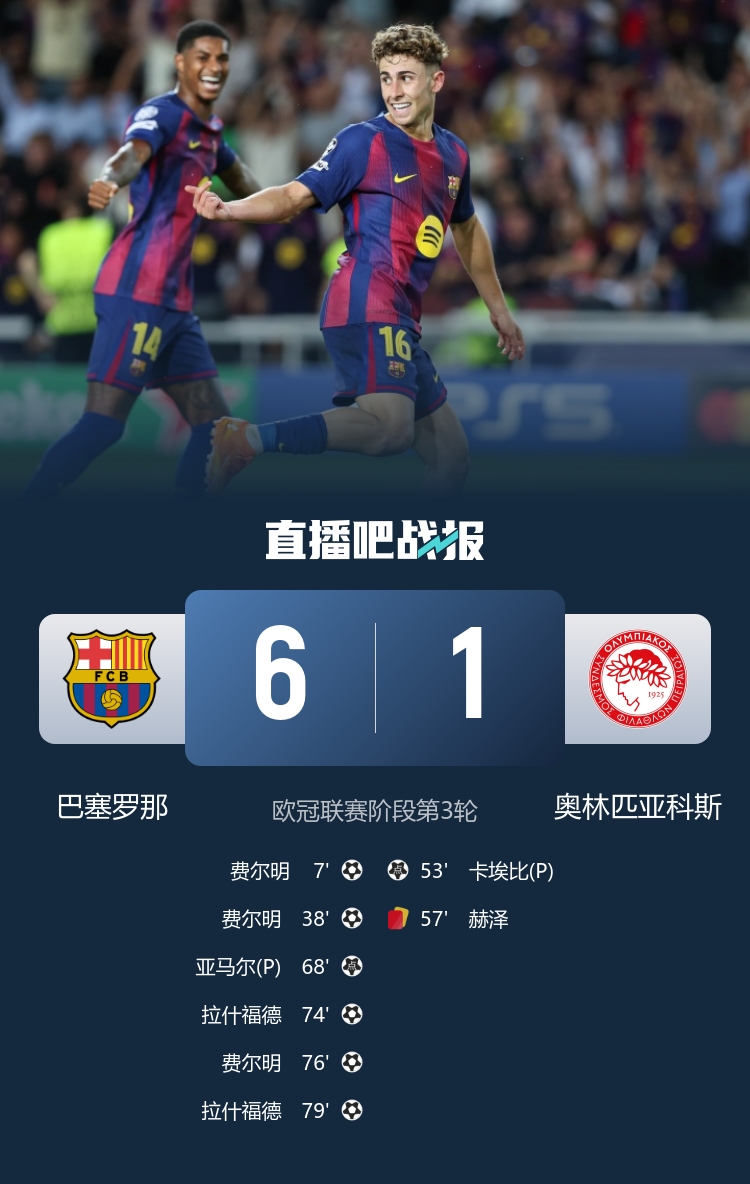 欧冠第3轮第一赛事 日9场赛事 全部结束,这9场赛事 一共轰进43球(场均4.8球),苏超在线直播高清视频无插件其中有三支球队单场轰出6+得分 (巴萨6-1奥林匹亚科斯、巴黎7-2勒沃库森、埃因霍温6-2那不勒斯)。