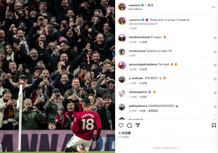 - 传射建功!卡塞米罗社媒晒热血 滑跪庆祝照:3连胜!曼联助威 !