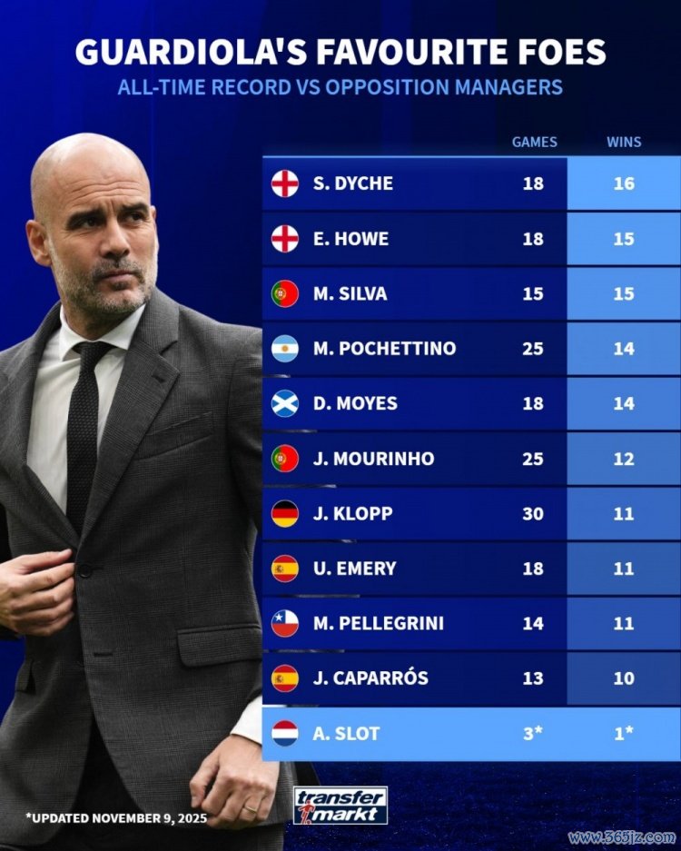 11月10日讯 曼城在本轮英超焦点战3-0完获胜 物浦,苏超直播瓜帅也取得了执教生涯对阵斯洛特的首胜。《转会市场》也列出了瓜帅执教生涯对阵指导教练员的胜场最多榜。