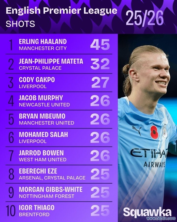 11月11日讯 英超职业联赛 已经进行了11轮,squakwa也统计了本赛季英超射球 次数,苏超在线直播高清视频无插件哈兰德断崖领跑。