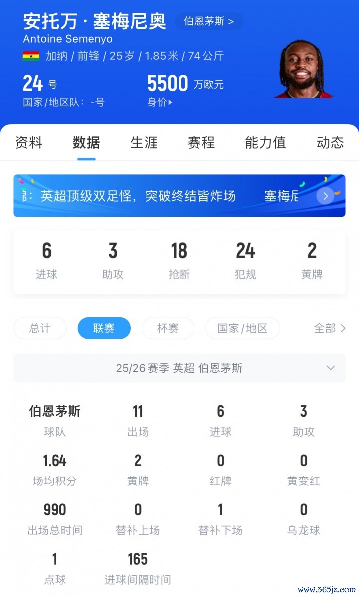 塞梅尼奥现年25岁,司职前场球员,他本赛季为伯恩茅斯出战11场英超,贡献6球3助,他与伯恩茅斯的合同将在2030年到期,现身价5500万欧。