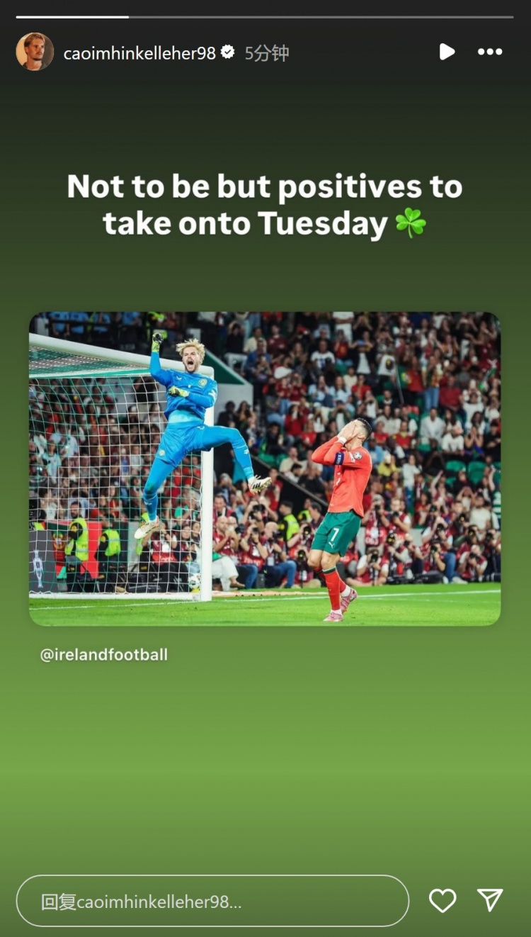 爱尔兰守门员凯莱赫社媒晒扑出C罗十二码球后庆祝的照片,苏超直播在线观看配文:“虽然未能如愿,但仍有积极因素可以带到周二的赛事 之中(对阵亚美尼亚)。”